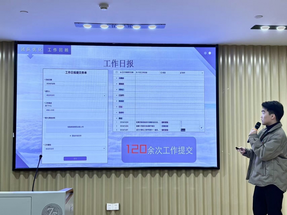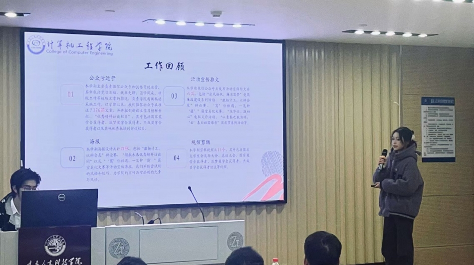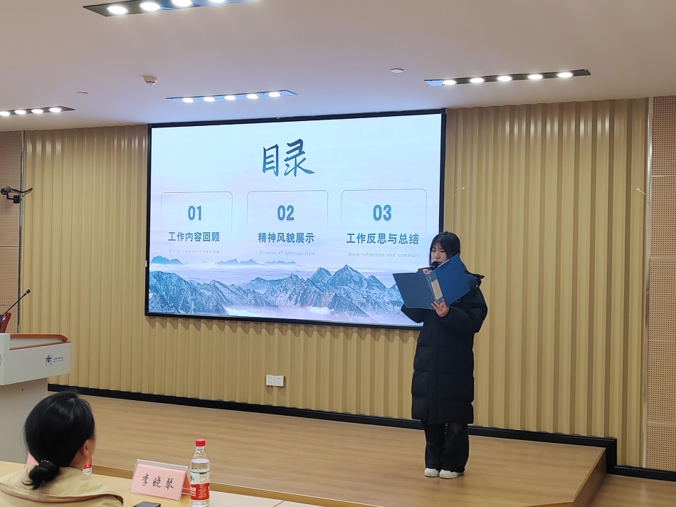 大会在全体合唱慷慨激昂的《义勇军进行曲》中正式拉开帷幕。大会伊始,各部门代表依次上台对本学期本部门所开展的工作进行总结,总结内容主要包括了部门工作内容、成果展示、不足之处以及未来规划等。从展示的结果来看,团总支、学生会成员在各自的岗位上都发挥着积极向上且重要的作用。团总支、学生会在工作中按照学院下发要求,高效的组织与开展活动工作。并且各部门都在各自的领域取得了亮眼的成绩。