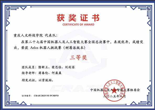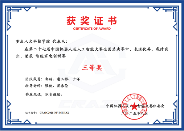 近日,第二十七届中国机器人及人工智能大赛全国总决赛圆满落幕。重庆人文科技学院计算机工程学院派出的“树莓派派来的队”和“云端队”两支队伍,在蒋春伦、张俊等老师的指导下,与全国高校同台竞技,凭借出色的创新能力和稳定的临场发挥,双双荣获全国三等奖,充分展现了学院学子扎实的专业素养和卓越的团队精神。