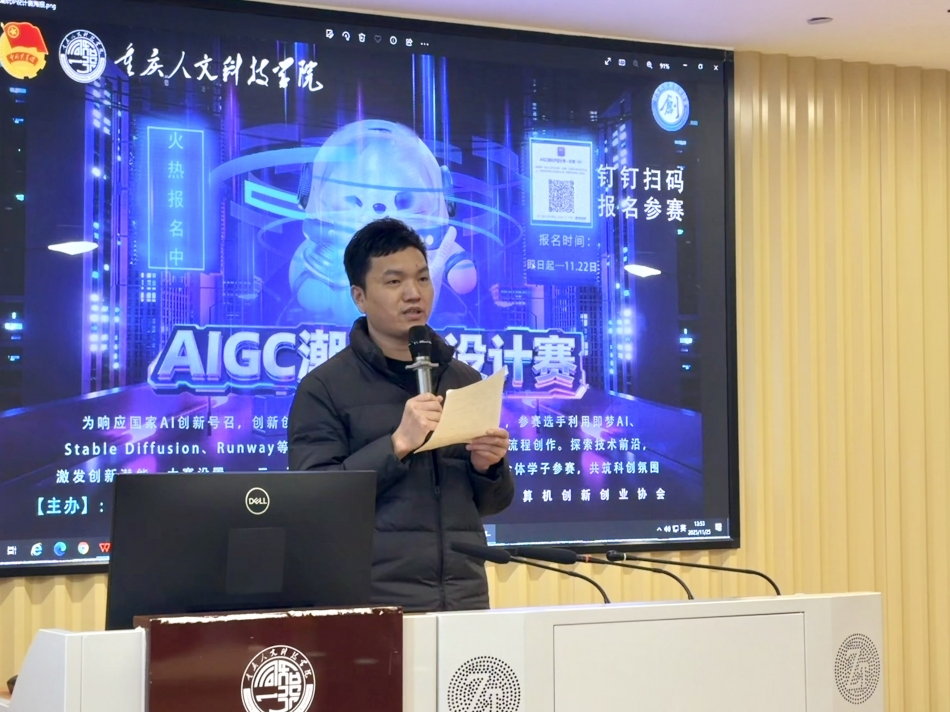为响应国家人工智能创新应用号召,培育校园创新型人才,2025年11月25日,计算机创新创业协会在15教1301举办的“AIGC潮玩IP设计赛”决赛圆满落幕。本次比赛共 12支队伍进行决赛答辩,决赛观看人员共90余人,此次活动成功以AIGC技术为笔,绘就了一场科技与美学碰撞的创意盛宴。会议由干事陈梦巧主持。