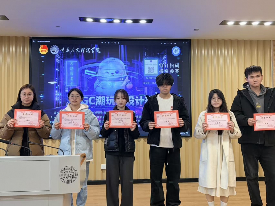 决赛现场,氛围热烈而有序。主持人开场后,12支队伍按抽签顺序依次登台,通过PPT展示作品,围绕设计灵感、AIGC技术应用过程、主题内涵、市场潜力等内容进行现场陈述。评委团依据作品创新性与设计力、技术实现度、作品完整性、PPT美观性及演讲表现等维度现场打分,工作人员高效完成分数统计与排名核算,确保结果公平公正。随后,主持人依次宣布获奖名单,嘉宾为获奖团队颁发荣誉证书与奖品:1支队伍斩获一等奖,2支队伍荣获二等奖,3支队伍摘得三等奖,6支队伍获得优秀奖。