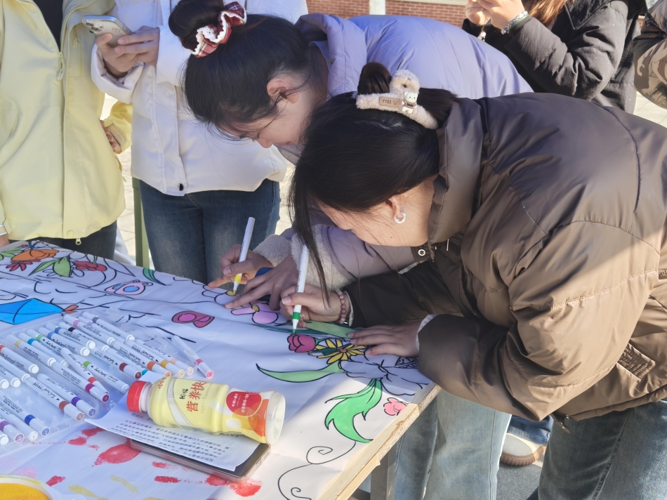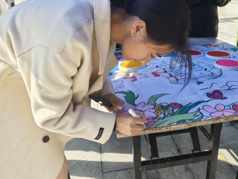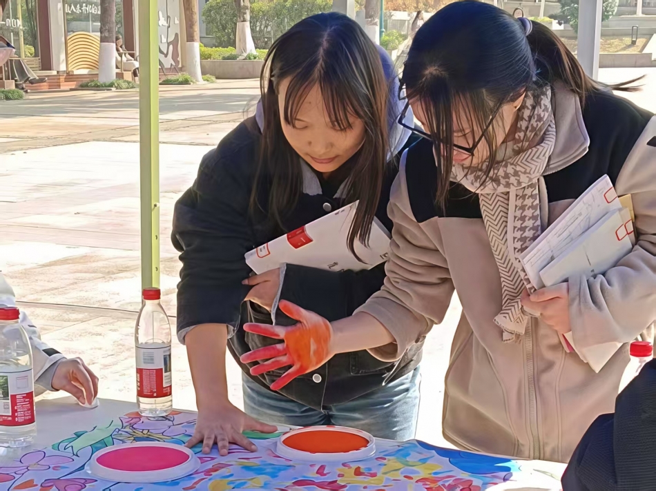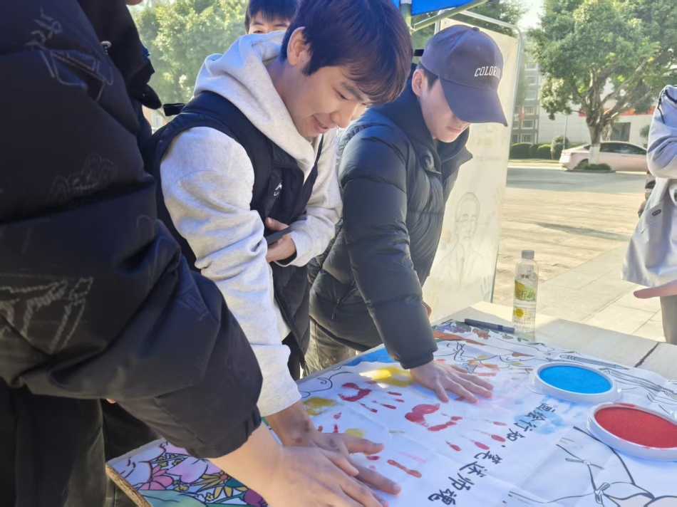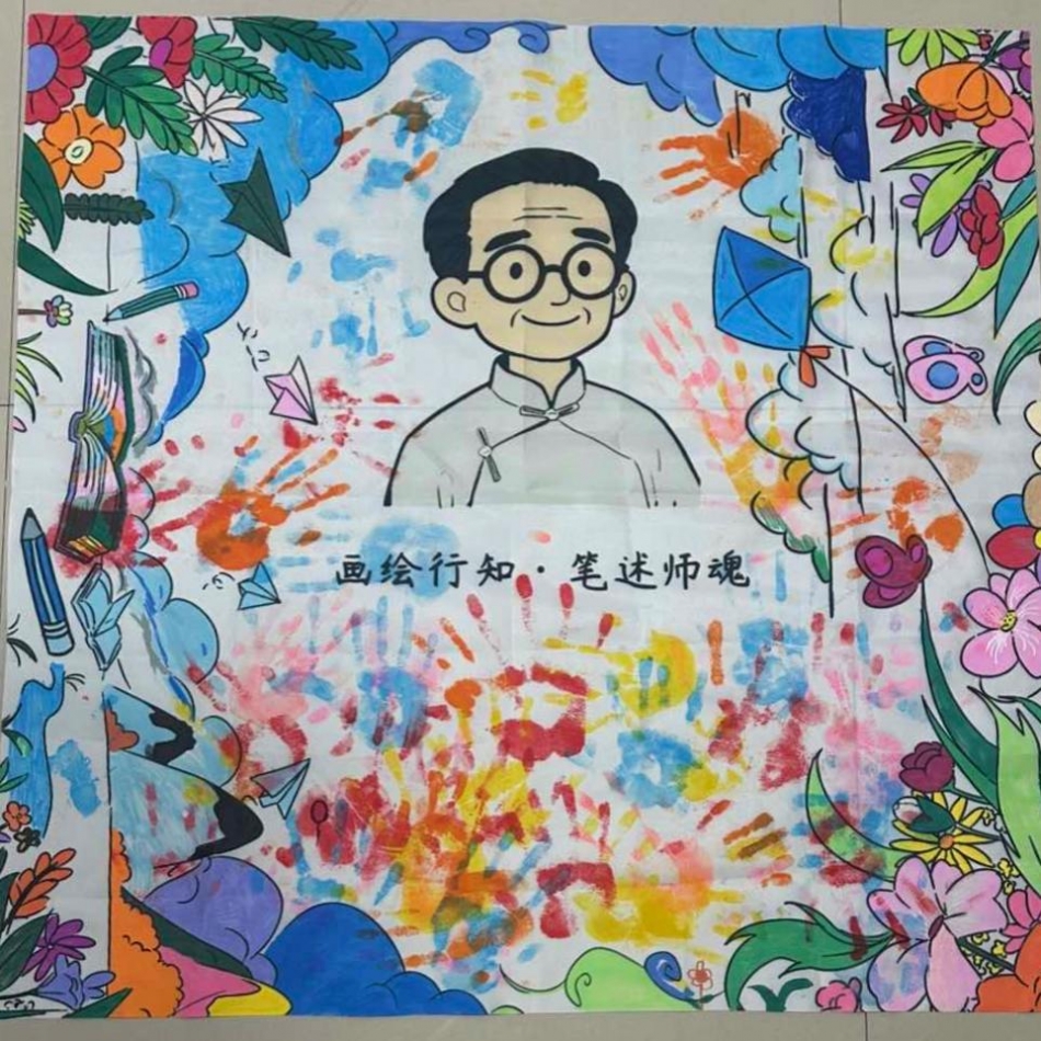 活动现场,铺设在长桌上的画布成为同学们挥洒创意的天地。大家手持画笔,以斑斓色彩描绘行知先生的教育理念,于留白处点缀青春想象。大家不仅用画笔勾勒师者仁风,更以掌心为印,在指定区域留下属于自己的热忱印记。每一抹色彩、每一枚手印,都是对“生活即教育”理念的生动诠释,展现了师魂与青春的同频共振。