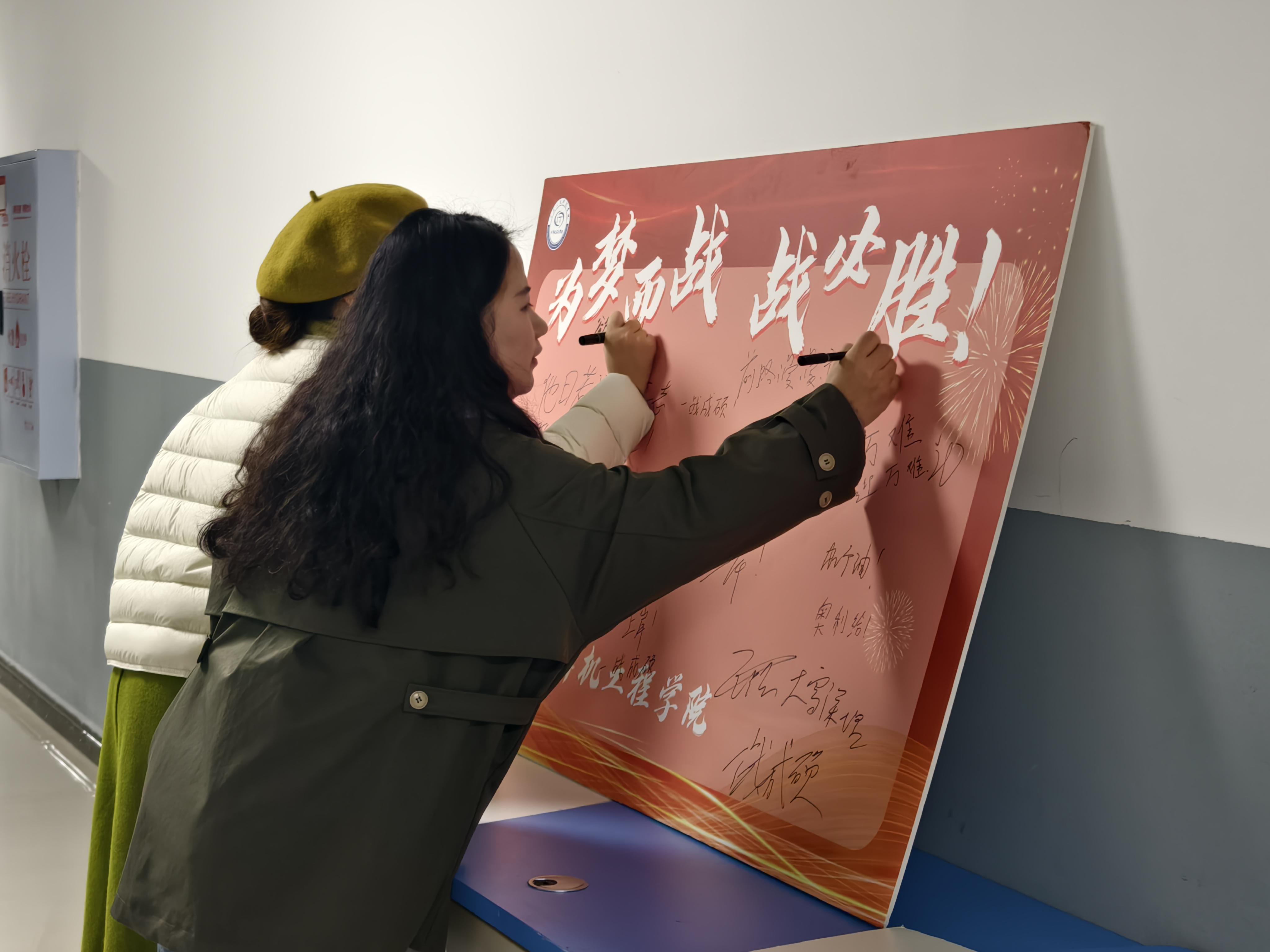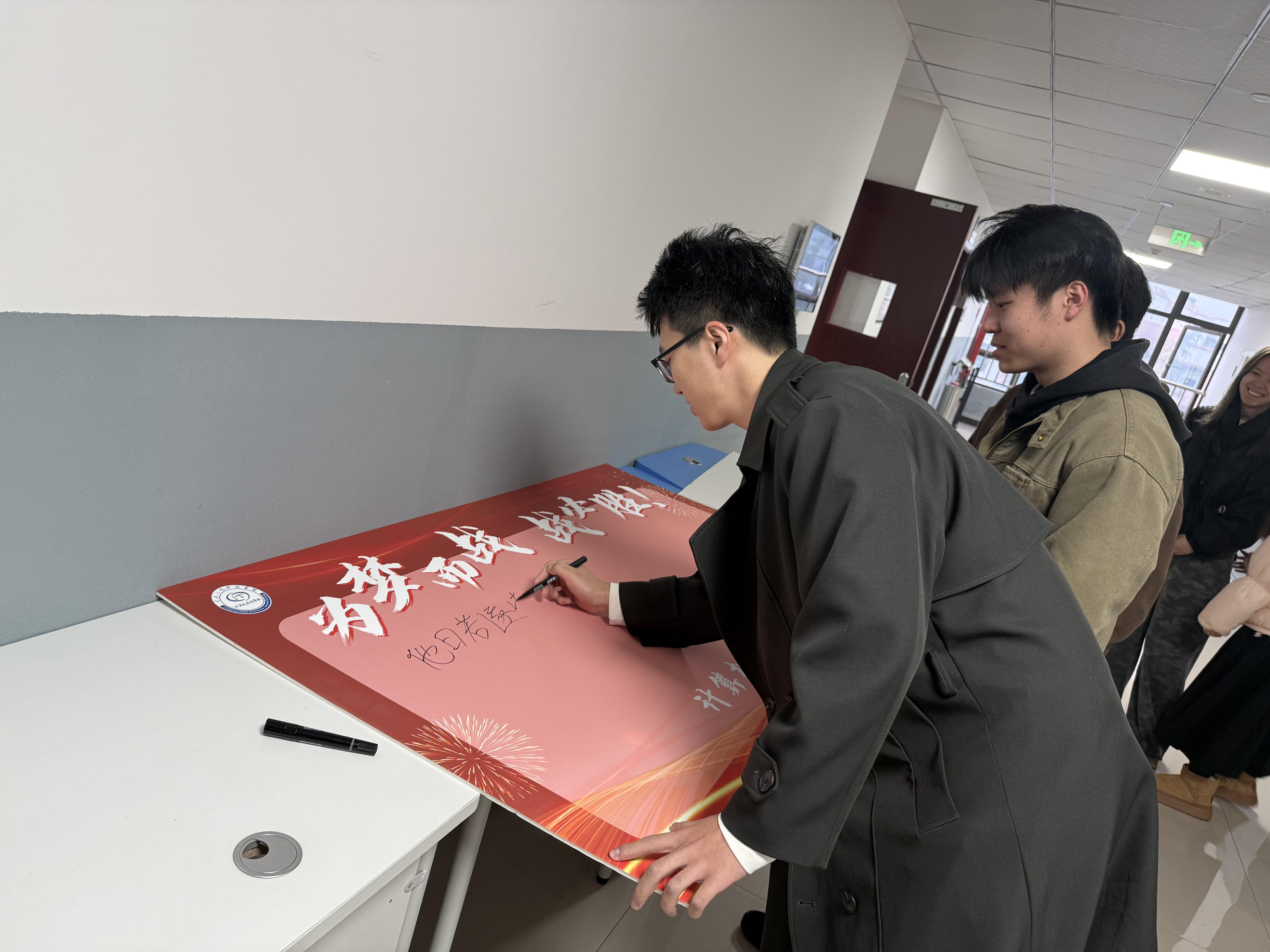 活动伊始,同学们有序走上前,在签名板上郑重写下自己的考研目标与美好期许。落笔的不仅是文字,更是青春的誓言与奋进的决心,现场氛围温暖而热烈,充满了拼搏向上的正能量。