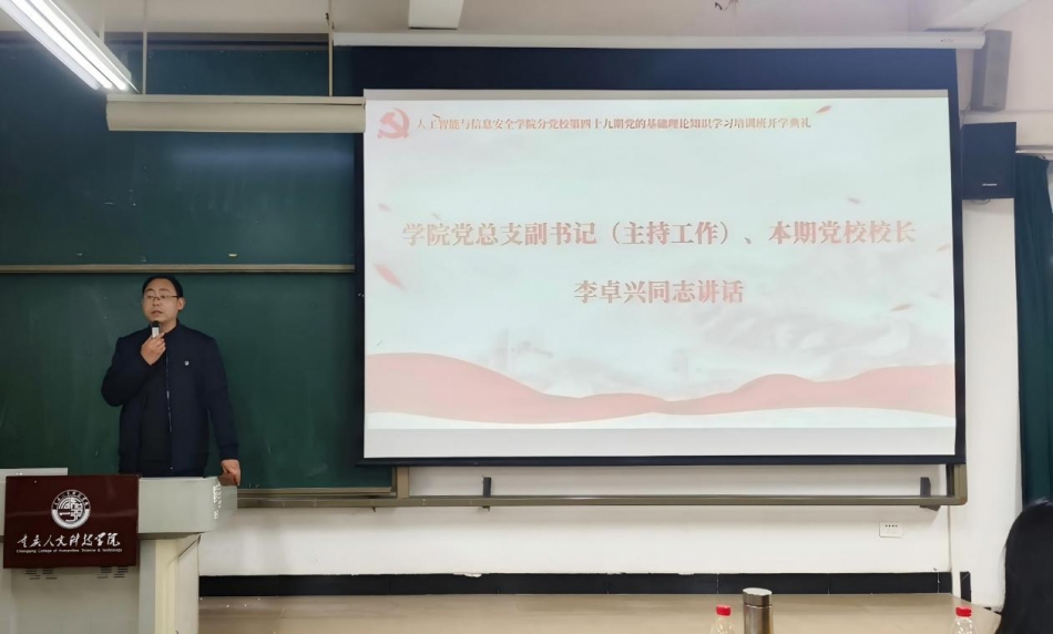 2026年4月2日,人工智能与信息安全学院分党校第49期党的基础理论知识学习培训班开班典礼在集思楼10308教室隆重举行。学院党总支负责人、分党校校长李卓兴,党校班主任张俊,辅导员及全体学员共同参加。典礼由张俊主持。